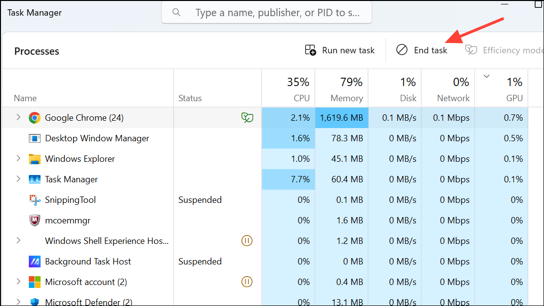 Step 4: To close an app that's consuming excessive resources, select it from the list and click on End task near the top of the Task Manager window. Be cautious not to close essential system processes, as this may cause instability.