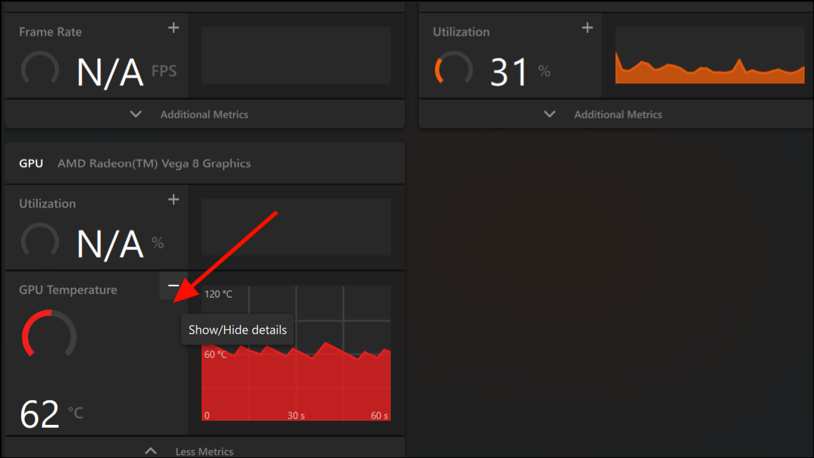 Step 4: View your GPU temperature along with other metrics such as utilization, clock speeds, power usage, and fan speed.