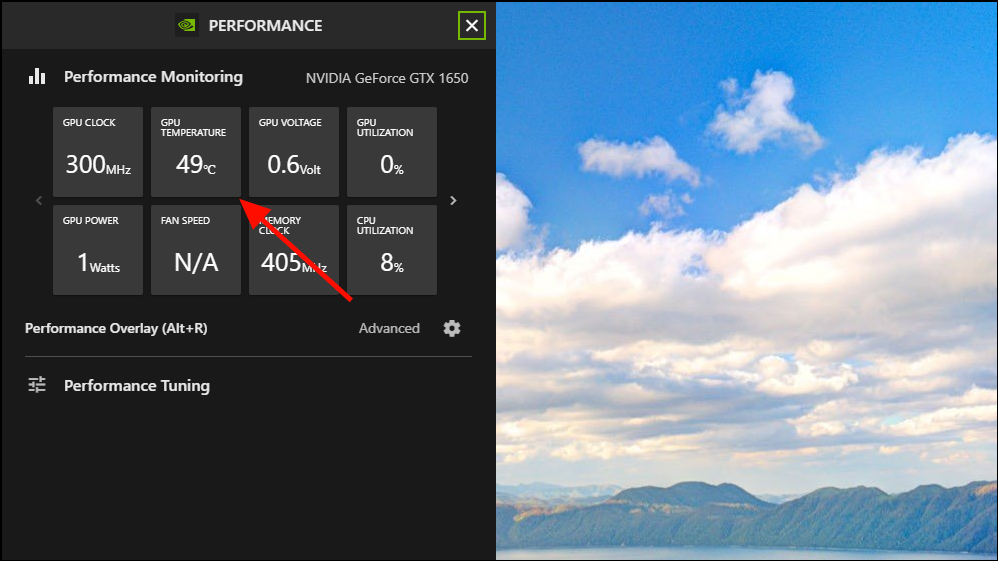 Step 4: The Performance panel displays your GPU temperature along with other important data like clock speeds, voltage, fan speed, and power usage.