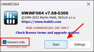 Step 2: Run HWiNFO and select the 'Sensors-only' option, then click 'Start'.