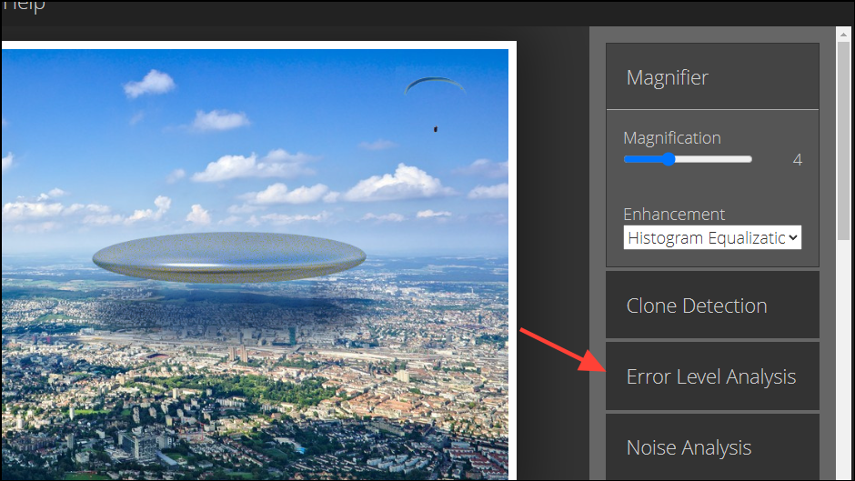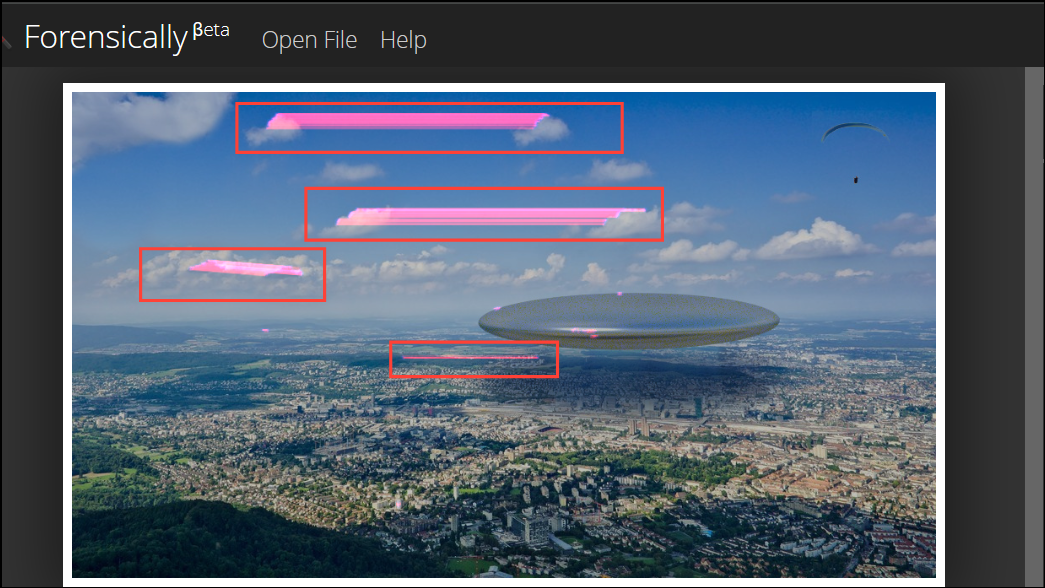 - To use Forensically, head to the website and you will see a sample image of a UFO hovering over a city. Move your cursor over the UFO and you will see that the pixels don't appear as in the rest of the image.