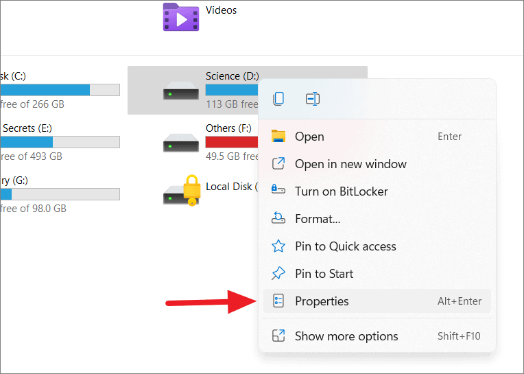 Step 3: For detailed information about a specific drive, right-click on the drive and select Properties from the context menu.