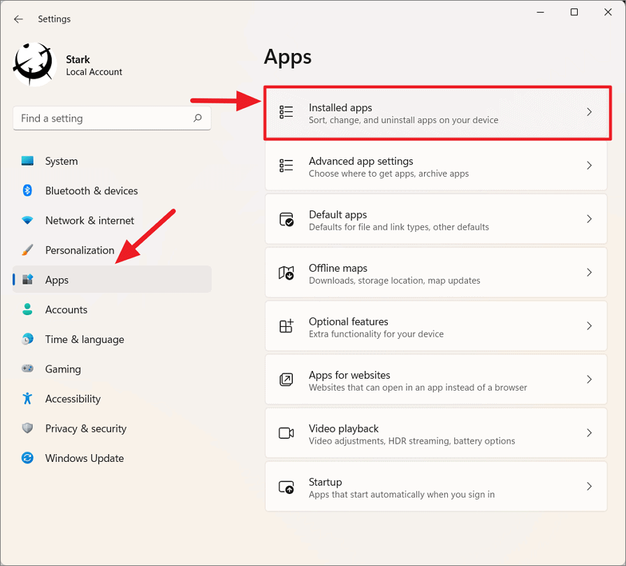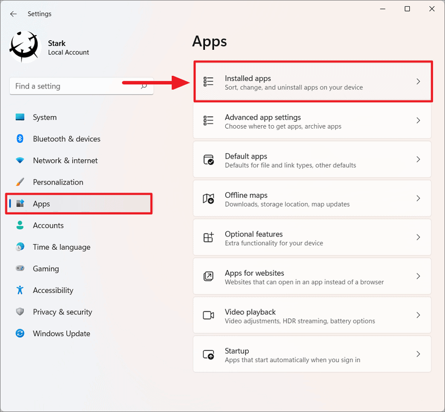 Step 1: In Settings, click on Apps from the left sidebar, then select Installed apps.