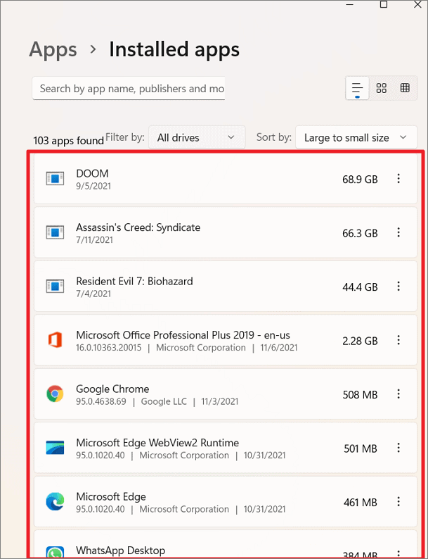 This section lists all installed applications along with their size. You can sort them by size to identify large apps that may no longer be needed.