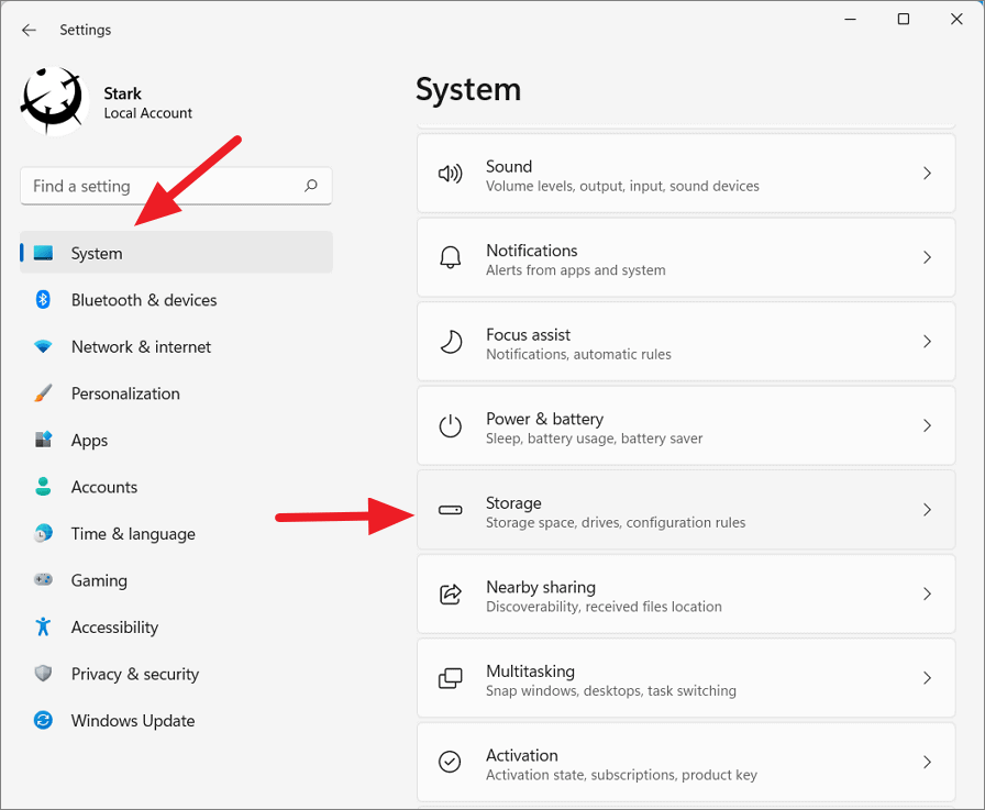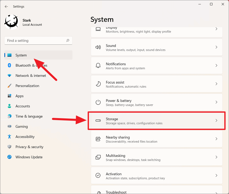 Step 2: In the left sidebar, click on System, then select Storage on the right.