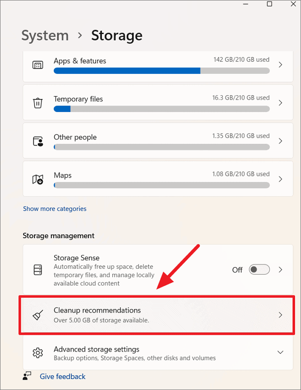 Step 2: Under Storage management, click on Cleanup recommendations.