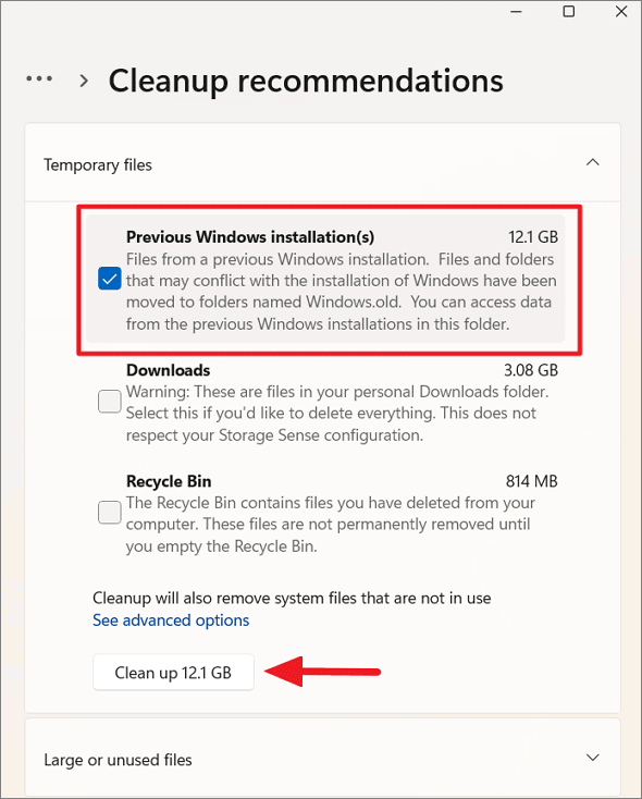 Step 4: Check the box next to Previous Windows installation(s), then click on Clean up. This action can free up a considerable amount of space.