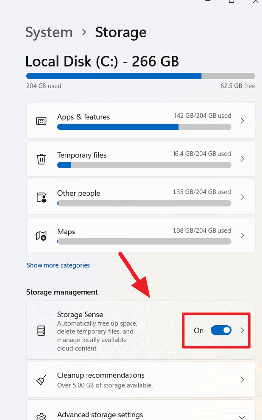 Step 1: Open Settings, navigate to System > Storage, and turn on the toggle next to Storage Sense.