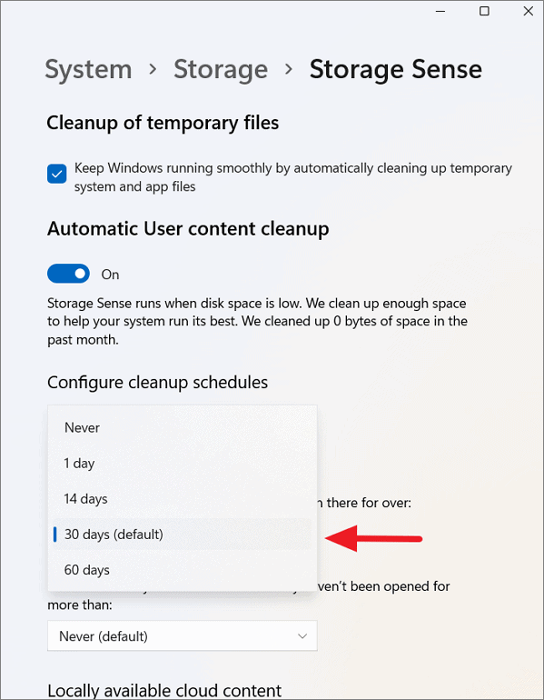 Step 4: Under Configure cleanup schedules, set how often you want Storage Sense to run and specify when to delete files from the Recycle Bin and Downloads folder.