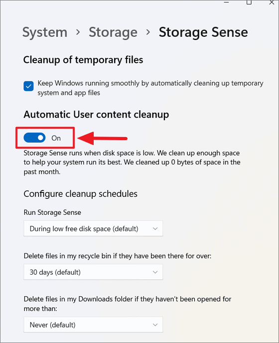Step 3: Enable Automatic User content cleanup to allow Storage Sense to run automatically based on your preferences.
