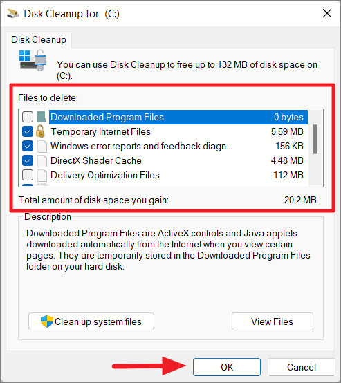 Step 5: Click OK, then confirm by clicking Delete Files to start the cleanup.