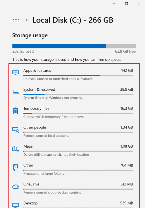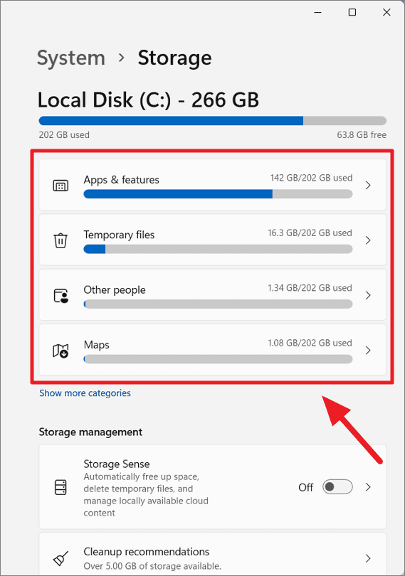 The Storage settings provide an overview of what's using space on your primary drive. Click on Show more categories to get a detailed breakdown.