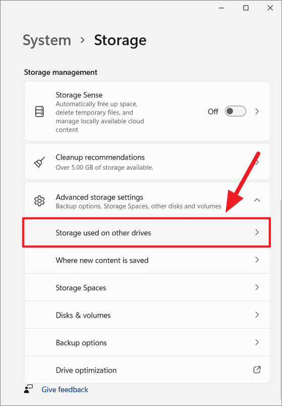 Step 3: To view storage usage for other drives, scroll down and click on Advanced storage settings, then choose Storage used on other drives.