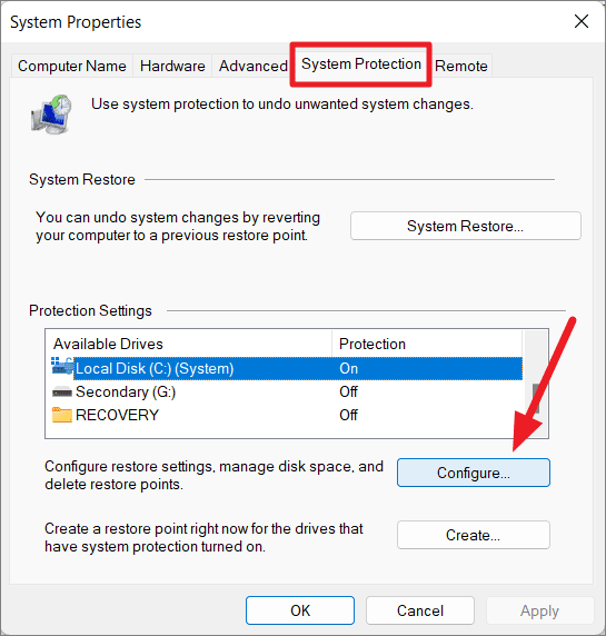 Step 2: Under Protection Settings, select your system drive (usually C:) and click on Configure.