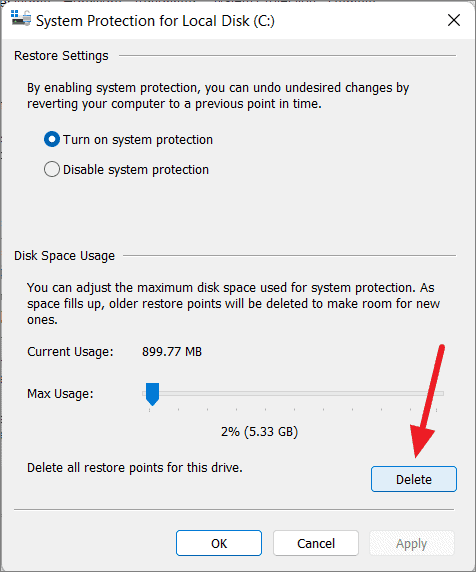 Step 3: Click on Delete to remove all restore points for the drive.