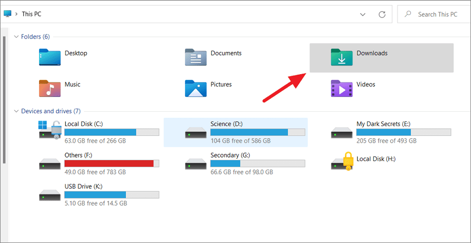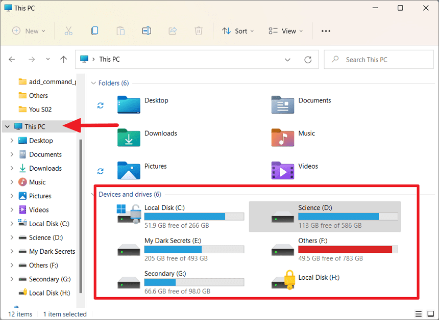 Step 2: In the left navigation pane, click on This PC. Under the Devices and drives section, you'll see all your drives along with a visual representation of their used and available space.