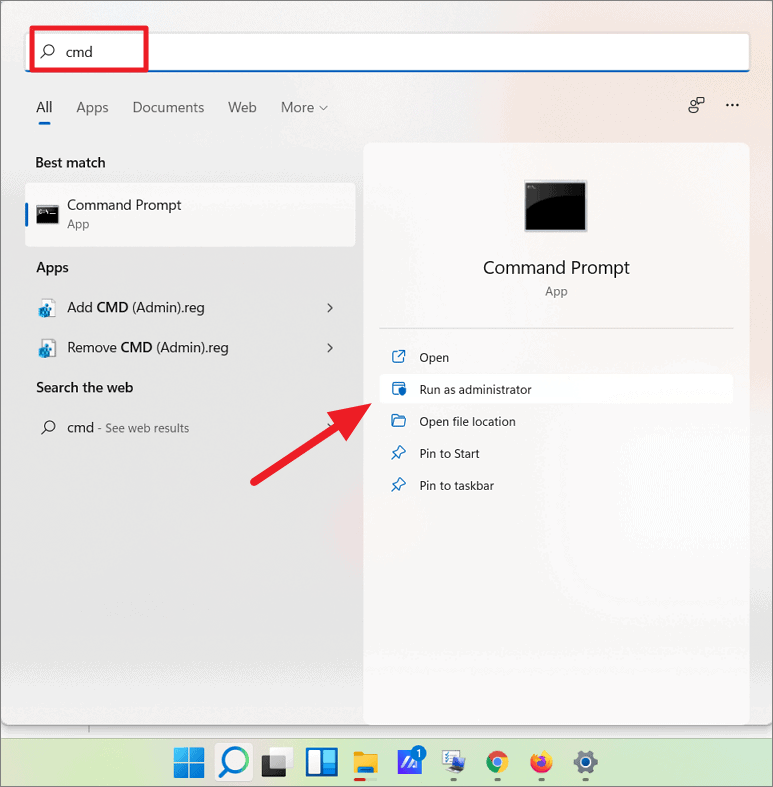 Step 1: Open Command Prompt as an administrator by searching for cmd, right-clicking on it, and selecting Run as administrator.