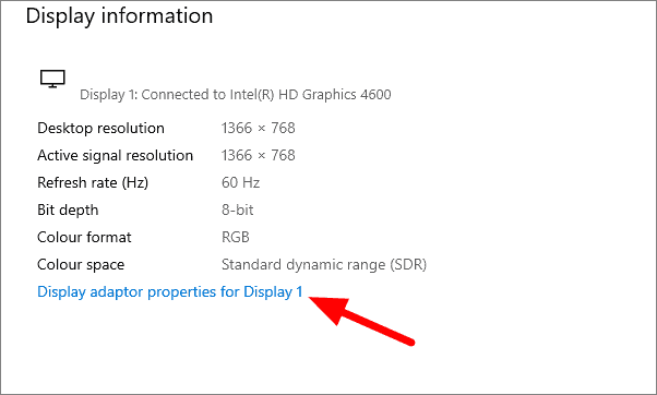 On the advanced display settings window, select ‘Display adaptor properties for Display 1’.