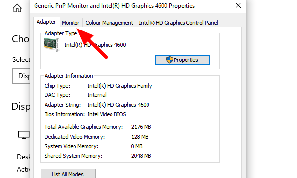In Graphics Properties, select the ‘Monitor’ tab right next to the adaptor tab.