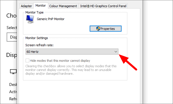 The refresh rate is displayed on the screen under ‘Screen refresh rate’. If you are using a monitor with a higher rated refresh rate than the one displayed here, you can also change the refresh rate.