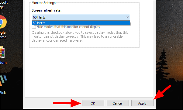 To change the refresh rate, click on the drop-down menu and select the appropriate option. Click on ‘Apply’ and then on ‘OK’.
