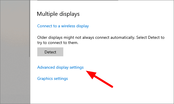 In the display setting, scroll down to the bottom and click on ‘Advanced display settings’.