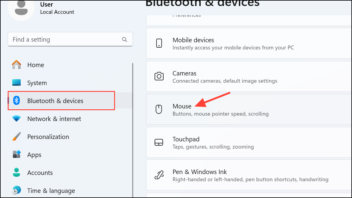 Step 2: Click on "Bluetooth & devices," then select "Mouse."