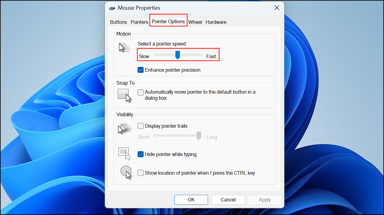Step 4: Navigate to the "Pointer Options" tab and adjust the slider under "Select a pointer speed" to increase or decrease sensitivity.