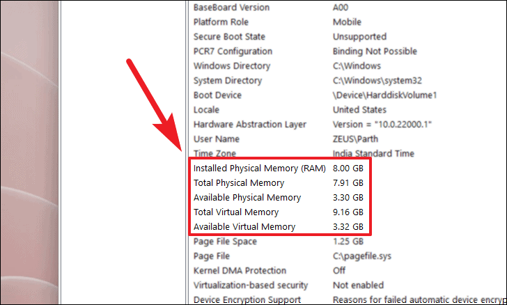 You can also find other RAM-related details such as Total Physical Memory, Available Physical Memory, Total Virtual Memory, and Available Virtual Memory.