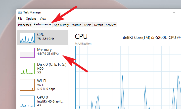 The Task Manager provides real-time statistics of your system's RAM usage along with other performance metrics.