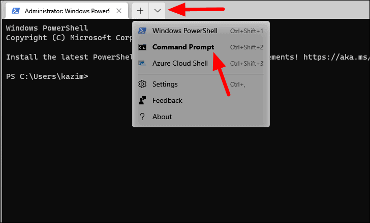 - If Command Prompt isn't your default profile, click the arrow icon at the top and select "Command Prompt". Alternatively, use Ctrl + Shift + 2 to open a Command Prompt tab.