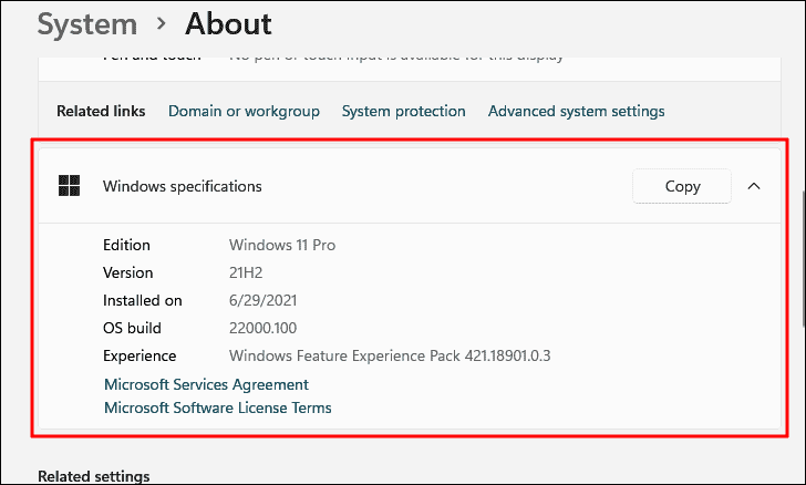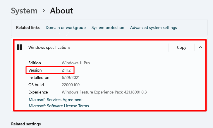 - You'll be redirected to the "About" section in System settings, displaying your Windows 11 version, edition, and OS build.