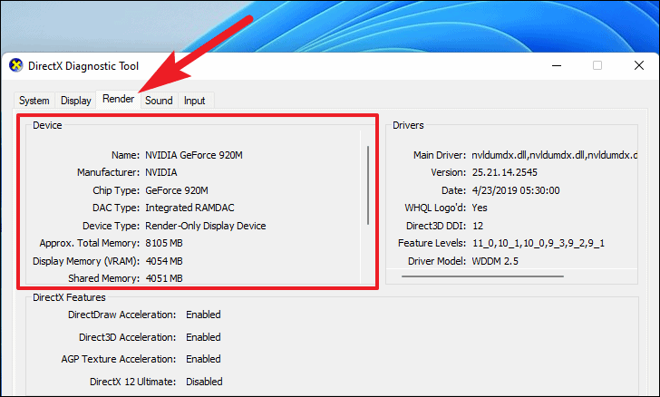 - If your system has multiple graphics cards, click on the Render tab to see information about the secondary GPU.