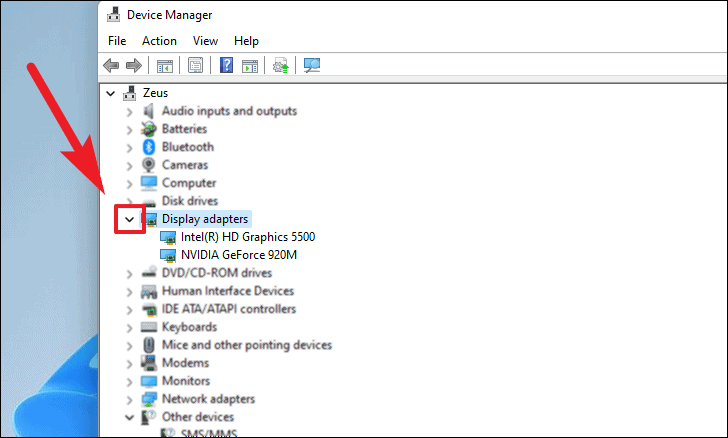 - In the Device Manager window, locate and expand the Display adapters category by clicking the arrow next to it.
