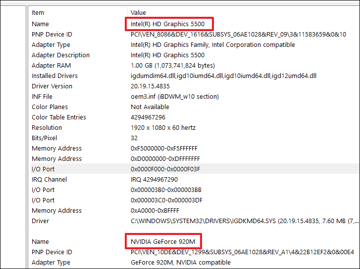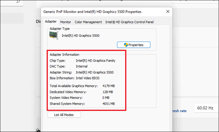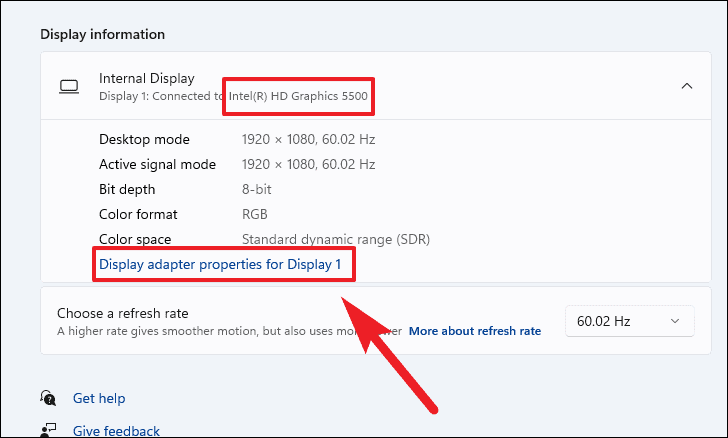- Under Display information, you can see the name of your graphics card next to your display. Click on Display adapter properties for Display 1 for more detailed information.