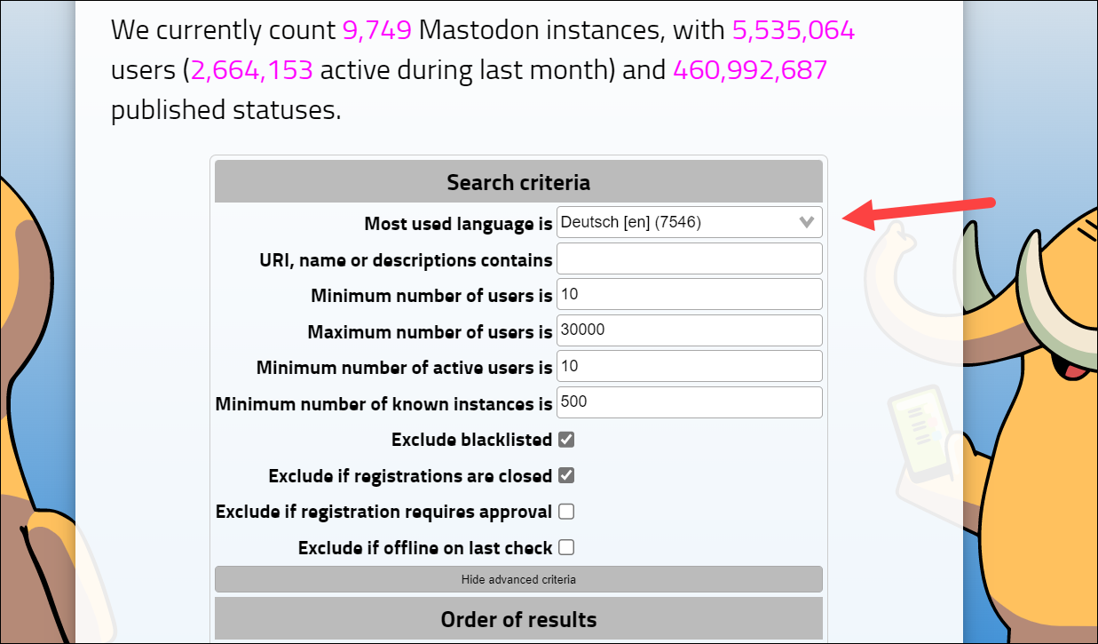 If you’re still not sure about which server to join, you can use the Server Search tool from Mastodon. Here, you can input different things you’re looking for in a server, like the most used language, words describing the server, the minimum and the maximum number of users, active users, etc. to get a match.