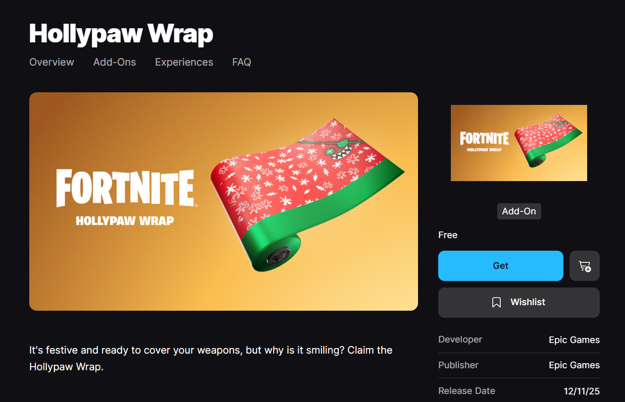 Hollypaw is an Uncommon Fortnite Wrap that’s being distributed as a free claim through the Epic Games Store. It’s part of the Luckypaw set, and it first released on Dec 11, 2025. In your Locker, it can be applied broadly to weapon slots like other wraps, giving your loadout a holiday-themed look.