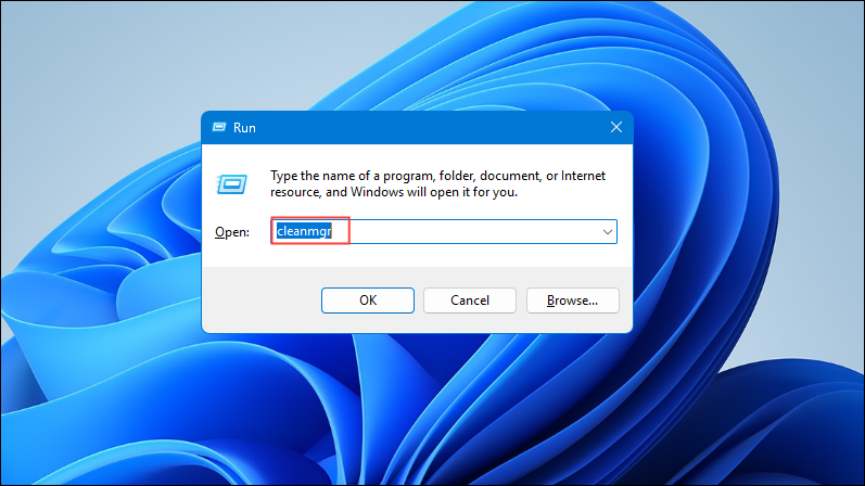 Step 1: Press Win + R to open the Run dialog box. Type cleanmgr and press Enter to launch Disk Cleanup.