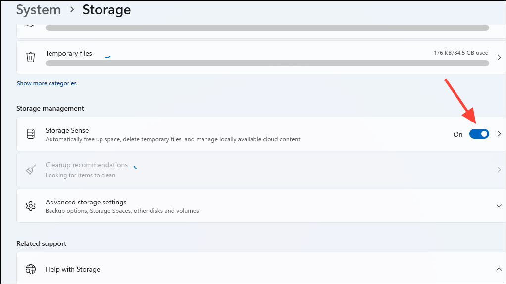 Step 2: Under the Storage settings, click on Cleanup recommendations. Windows will analyze your drive and suggest files you can safely remove, such as Temporary files, Large or unused files, Files synced to the cloud, and Unused apps.