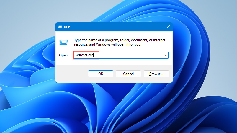 Step 2: Clear the Microsoft Store cache by pressing Win + R, typing wsreset.exe, and pressing Enter. A blank Command Prompt window will briefly appear, and the Store will open automatically.