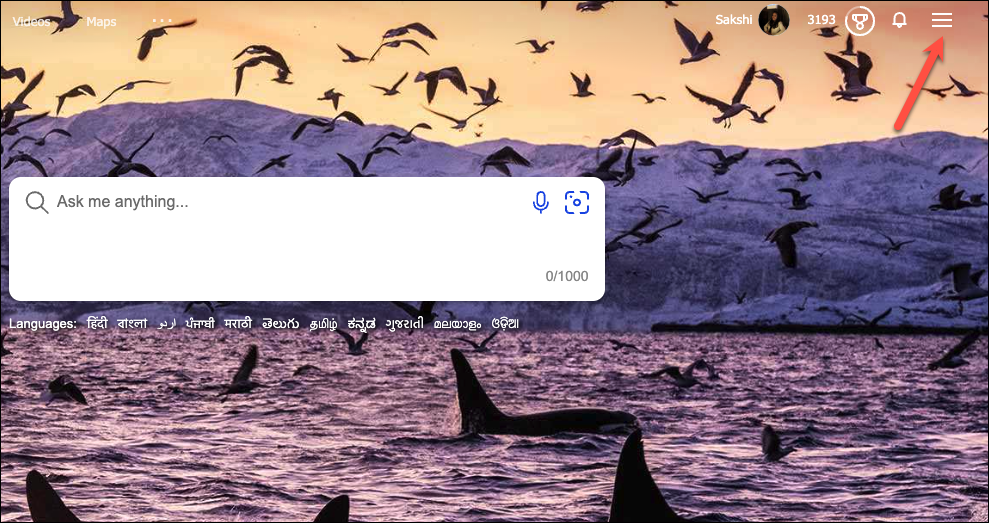 Now, clearing the search history for Bing AI is the same as clearing the search history for Bing. From the Bing homepage, click the ‘Settings and Quick Link’ option (hamburger menu option) from the top-right.