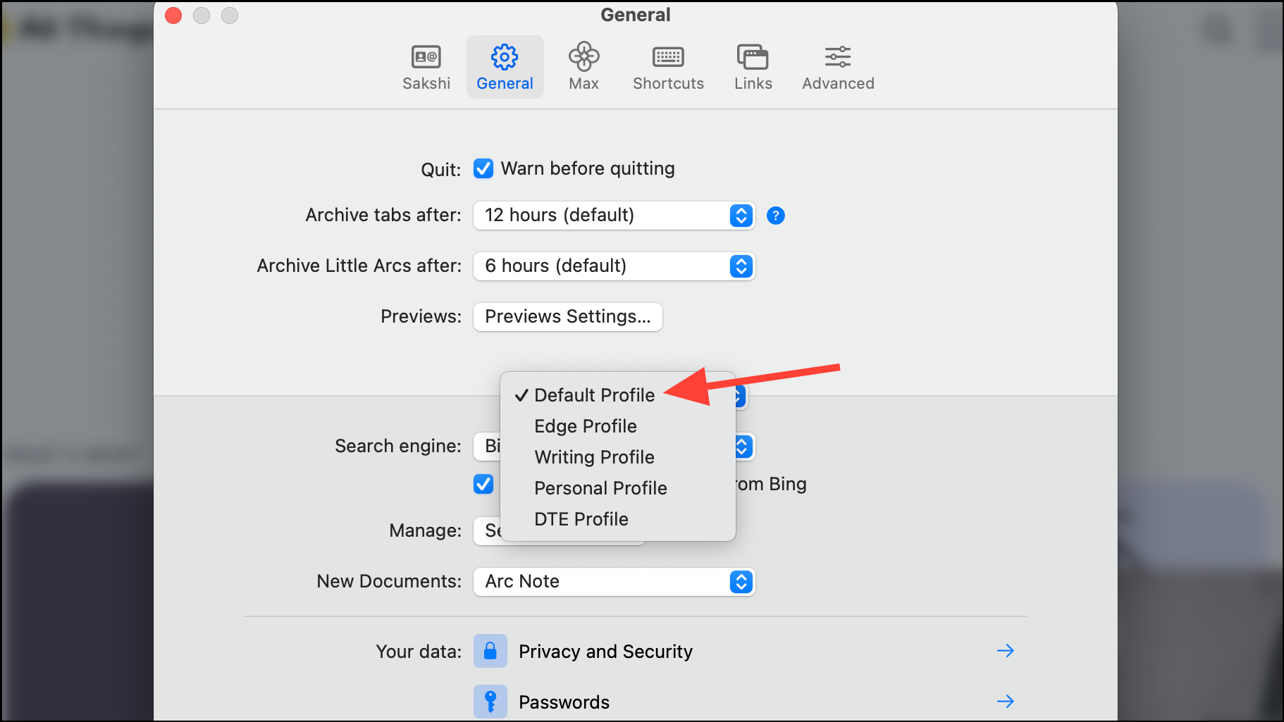 - Next, if you have more than one profile in Arc, go to the 'Default Profile' drop-down option, click on it, and select the correct profile for which you want to delete the cache & cookies. This step is important; otherwise, you'll end up deleting the cookies and cache for the wrong profile.