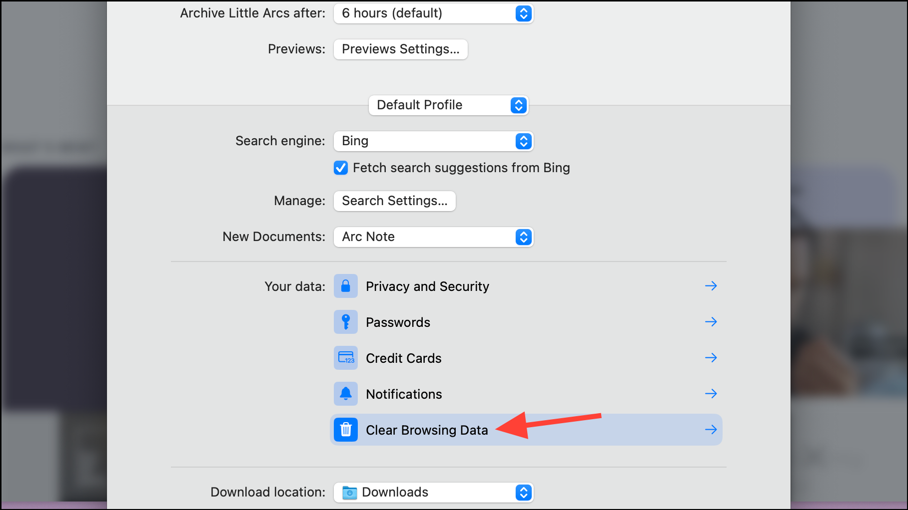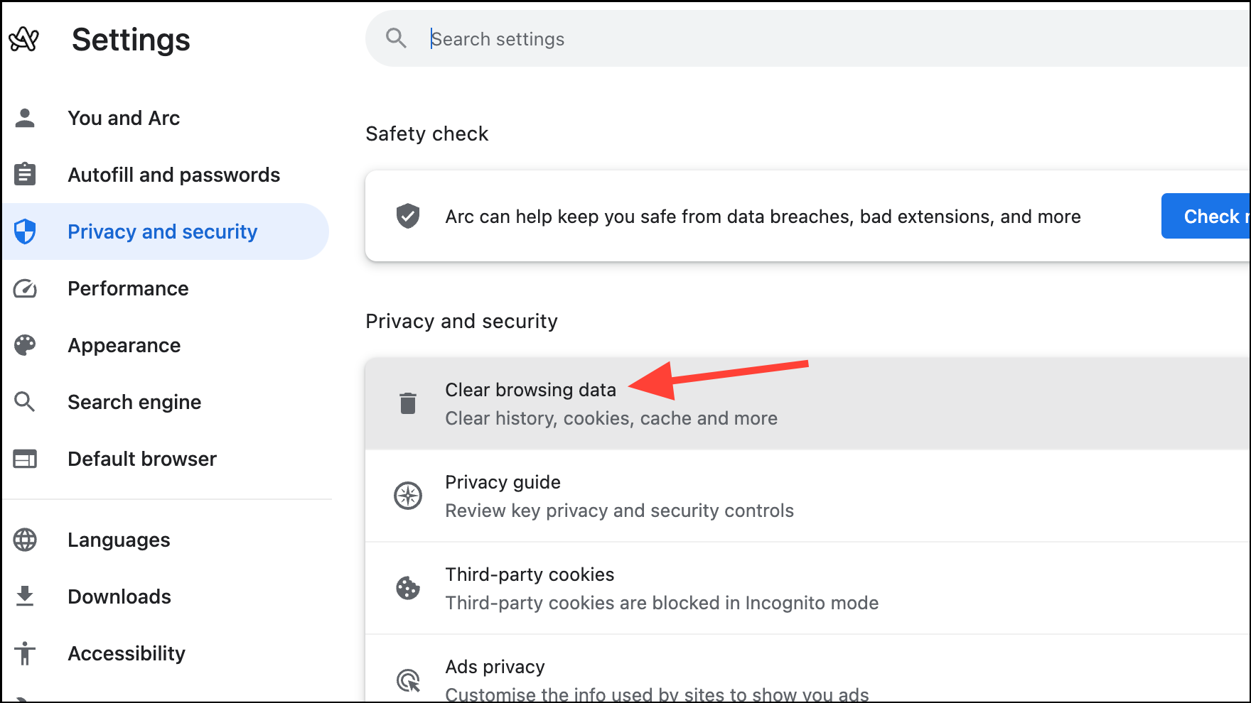 Cmd+Tand typearc://settings/privacyto bypass everything till now and directly arrive here. But be sure that you're opening it in the right profile if you choose to open it directly. - Now, click on 'Clear browsing data'.