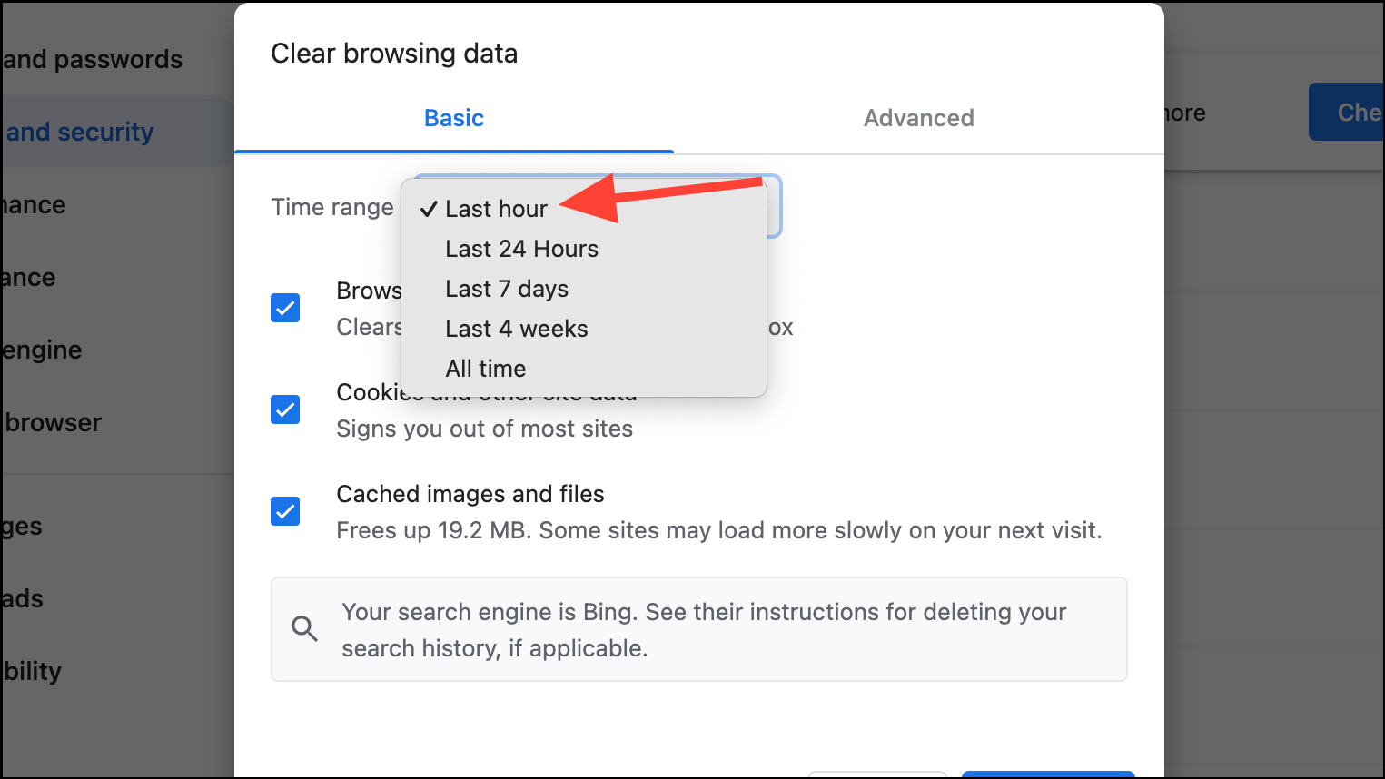 - From the 'Time range' drop-down, select the time period for which you want to delete the cache and cookies. You can delete them for the last hour, last 24 hours, last 7 days, last 4 weeks, or all time.