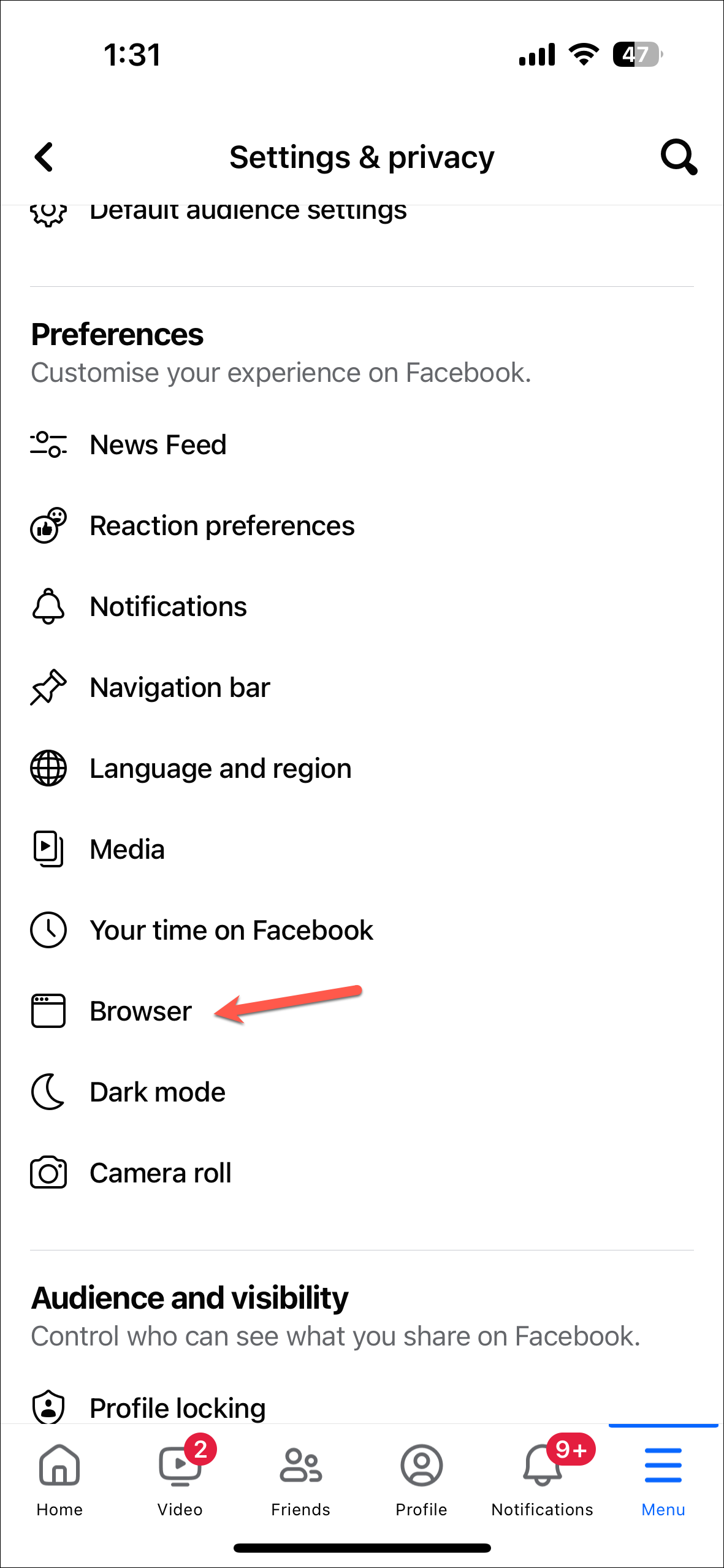 - Scroll down in the settings menu and tap the option for 'Browser' in the Preferences section.