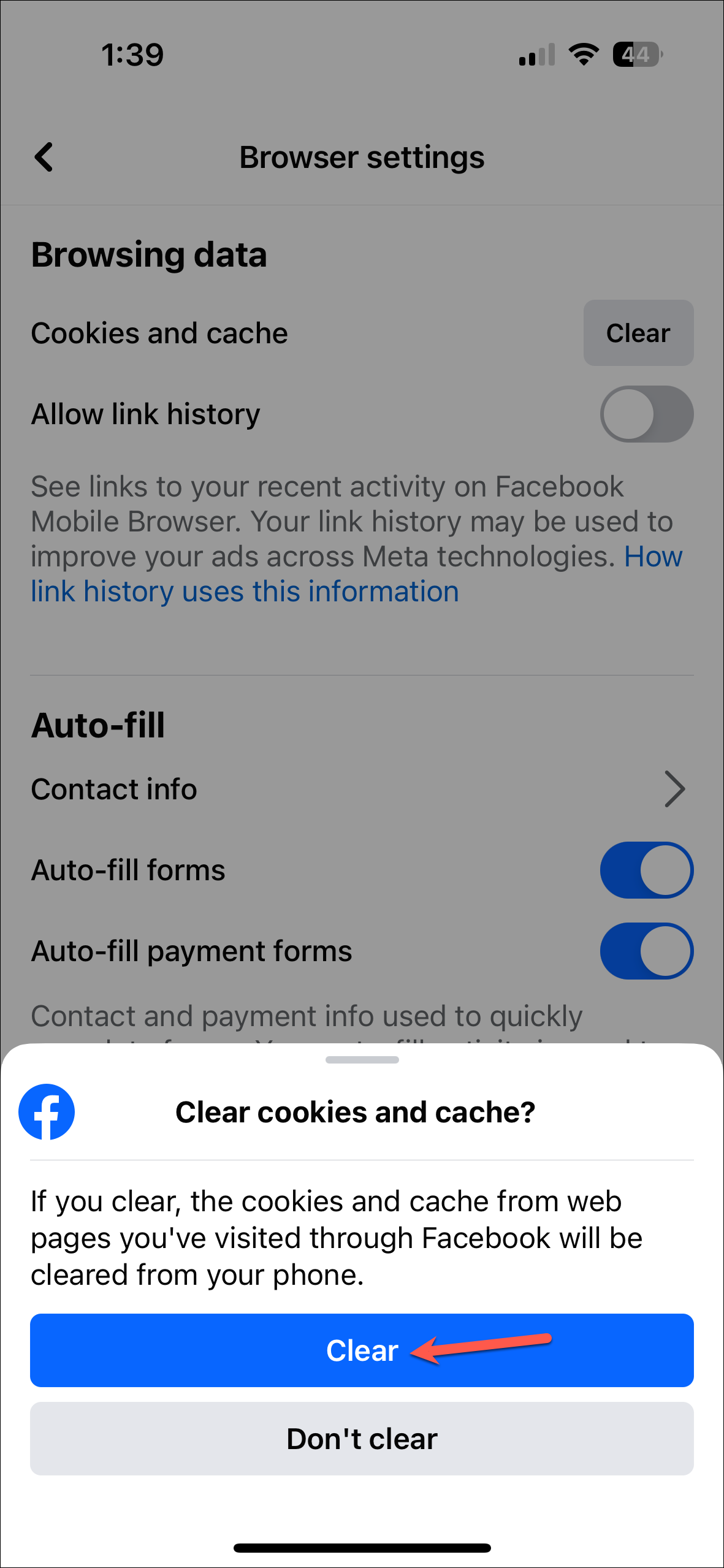 - Tap the 'Clear' button next to 'Cookies & Cache' under Browsing data.