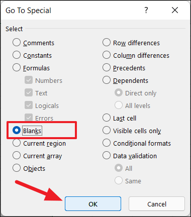 This will open the Go To Special dialog box. Here, select the ‘Blanks’ option and click ‘OK’.