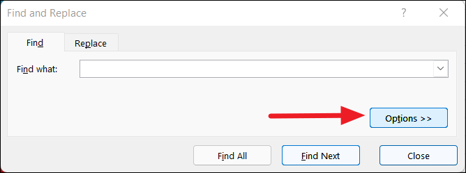 This will open the Find and Replace dialog box. Now, click the ‘Options’ button to expand advanced options.