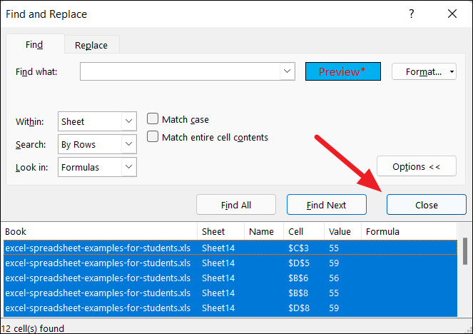 Doing this will change the cursor to a plus icon and a dropper. Now, simply select the cell that has the formatting you want to remove. Once you do that, you will see that the formatting you selected is shown in the ‘Preview’ box next to the ‘Find what:’ field (as shown below).