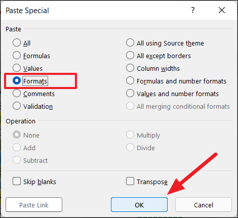 In the Paste Special dialog box, select the ‘Formats’ option under Paste and click ‘OK’.